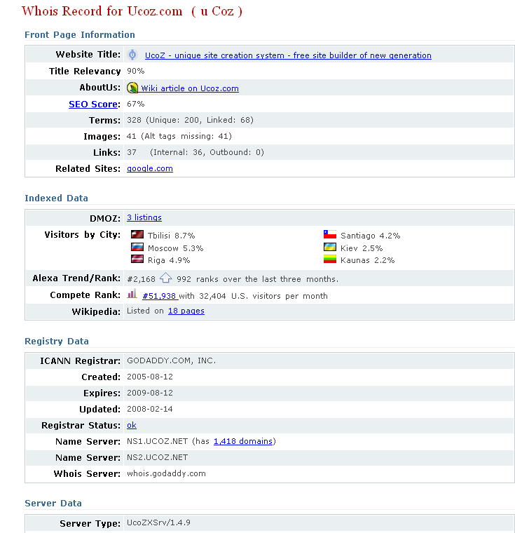 Front Page Information Website Title: uCoz - unique site creation system - free site builder of new generation AboutUs: Wiki article on Ucoz.com SEO Score: 67% Terms: 328 (Unique: 200, Linked: 68) Images: 41 (Alt tags missing: 41) Links: 37 (Internal: 36, Outbound: 0) Related Sites: google.com Indexed Data DMOZ: 3 listings Visitors by City: GE Tbilisi 8.7% RU Moscow 5.3% LV Riga 4.9% CL Santiago 4.2% UA Kiev 2.5% LT Kaunas 2.2% Alexa Trend/Rank: #2,168 The lower the rank the better. 992 ranks over the last three months. Compete Rank: #51,938 with 32,404 U.S. visitors per month Wikipedia: Listed on 18 pages Registry Data ICANN Registrar: GODADDY.COM, INC. Created: 2005-08-12 Expires: 2009-08-12 Updated: 2008-02-14 Registrar Status: ok Name Server: NS1.UCOZ.NET (has 1,418 domains) Whois Server: whois.godaddy.com IP Address: 208.100.61.101 [Whois] [Reverse-Ip] [Ping] [DNS Lookup] [Traceroute] IP Location United States - United States - Nozone Inc Response Code: 200 Blacklist Status: Clear Domain Status: Registered And No Website DomainTools Exclusive Registrant Search: "Compubyte Limited" owns about 15 other domains Email Search: is associated with about 12 domains Registrar History: 2 registrars with 1 drop. NS History: 11 changes on 8 unique name servers over 6 years. IP History: 8 changes on 7 unique name servers over 3 years. Whois History: 215 records have been archived since 2000-09-30. Monitor Domain: [Monitor this domain] Set Free Alerts on ucoz.com Free Tool: Download DomainTools Registrant: Trident Trust Company Limited Trident Chambers, P.O. Box 146 Road Town, Tortola VG1110 Virgin Islands (British) Domain Name: UCOZ.COM Created on: 12-Aug-05 Expires on: 12-Aug-09 Last Updated on: 17-Sep-07 Administrative Contact: Yevtukhov, Yuriy Compubyte Limited Trident Trust Company Limited Trident Chambers, P.O. Box 146 Road Town, Tortola VG1110 Virgin Islands (British) +380.472719925 Fax -- +380.472719925 Technical Contact: Yevtukhov, Yuriy Compubyte Limited Trident Trust Company Limited Trident Chambers, P.O. Box 146 Road Town, Tortola VG1110 Virgin Islands (British) +380.472719925 Fax -- +380.472719925 Domain servers in listed order: NS1.UCOZ.NET NS2.UCOZ.NET Attachments: